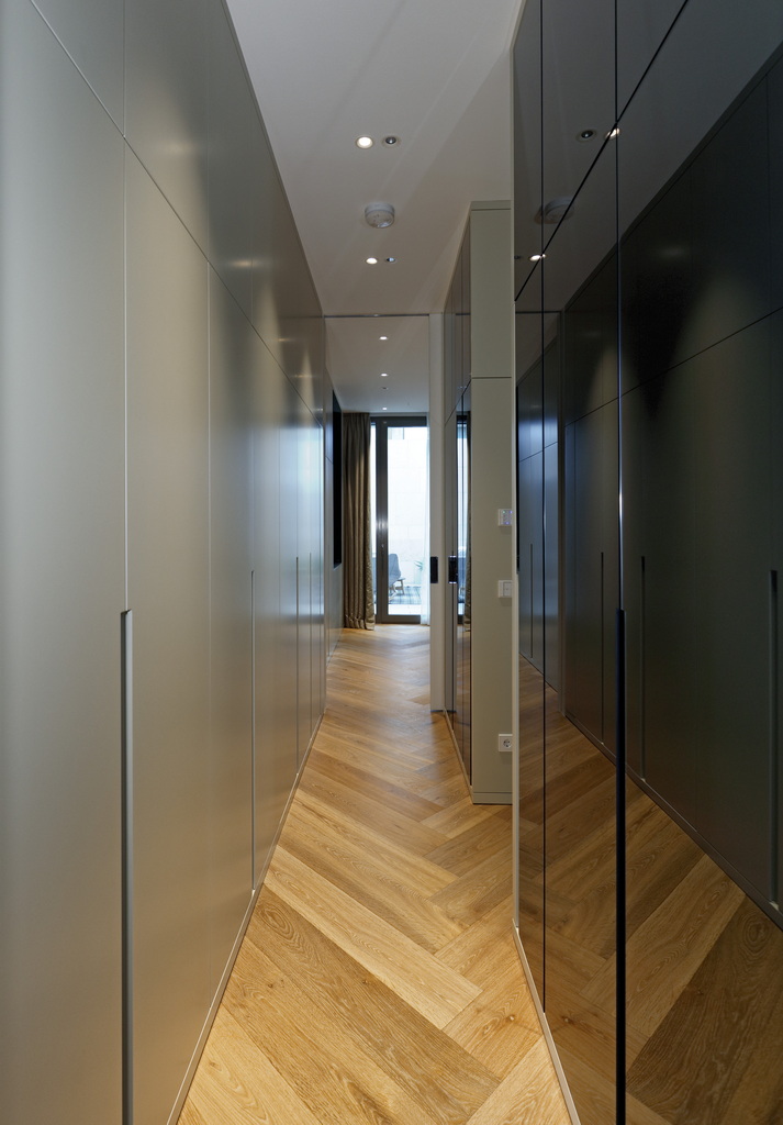 Die Möblierung wurde aus hochwertigen Materialien gefertigt. Die Möbelfronten wurden aus exklusiven Furnieren wie Nussbaum- oder Eiche gebeizt oder auch in farbig lackierter Oberfläche hergestellt. Die Garderobenschränke in den Eingangshallen wurden mit raumhohen Spiegeltüren mit speziellen in unserer Manufaktur gefertigten Griffleisten hergestellt. Alle Schränke sind im Innenraum mit LED-Lichtleisten ausgestattet. Eine besondere Anforderung bestand auch darin, die zum Teil bauseits vorhandenen Revisionsklappen und Verteilerschränke so zu umbauen, dass diese nicht mehr sichtbar sind und dennoch für den Fall der Wartung problemlos zugänglich bleiben.